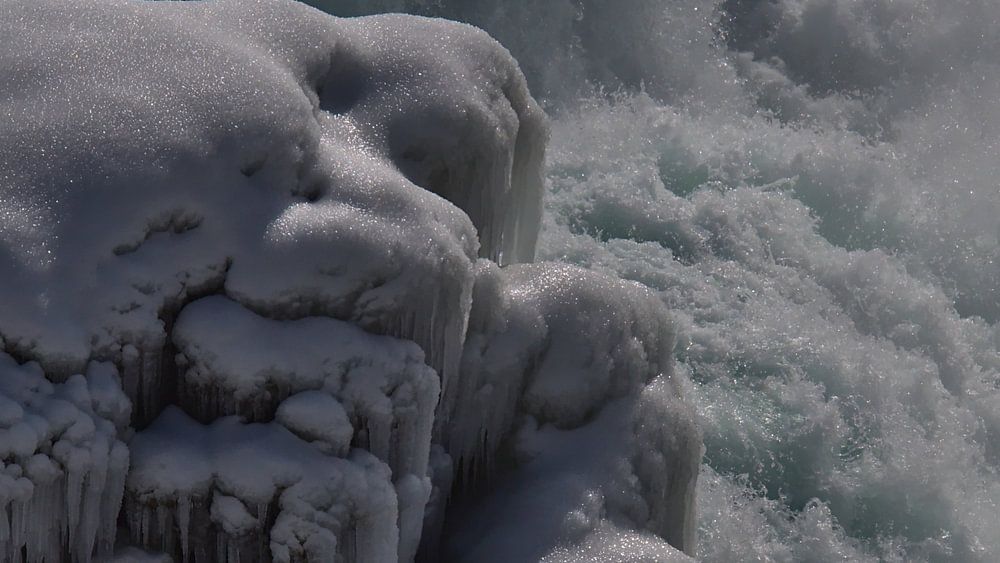 Close-up van de wilde waterval Gullfoss, onderdeel van de Gouden Cirkel in het westen van IJsland, in de winter met besneeuwde rotsen en bizarre ijsformaties.