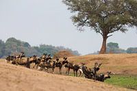 Wilde Honden, die in Mana Pools, Zimbabwe komen drinken bij een bijna drooggevallen waterplas. Ze zijn uiterst voorzichtig, vanwege het gevaar dat krokodillen veroorzaken.