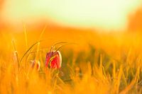 Wilde Kievitsbloem (Fritillaria meleagris) in een weiland tijdens een mooie voorjaarszonopgang met druppels dauw op het gras. De Fritillaria meleagris groeit in de uiterwaarden van de IJsseldelta.