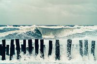 Op de foto zie je hoge golven het strand op rollen. Op de voorgrond zie je houten pilaren die deze golven moeten breken, zogenaamde strandhoofden. Deze foto is genomen op een stormachtige dag op de Noordzee in Nederland.