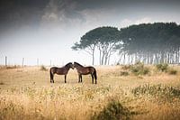 Twee wilde paarden in een symetrische houding op het eiland Langeland in Denemarken.