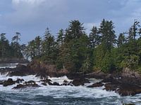 Landschapsopname van de wilde kust van de Stille Oceaan bij Ucluelet op Vancouver Island, British Columbia, Canada in de herfst met ruige rotsen, ruwe zee en groene bomen op een bewolkte dag.