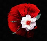 Abstract fantasie schilderij in rood en zwart met een witte roos