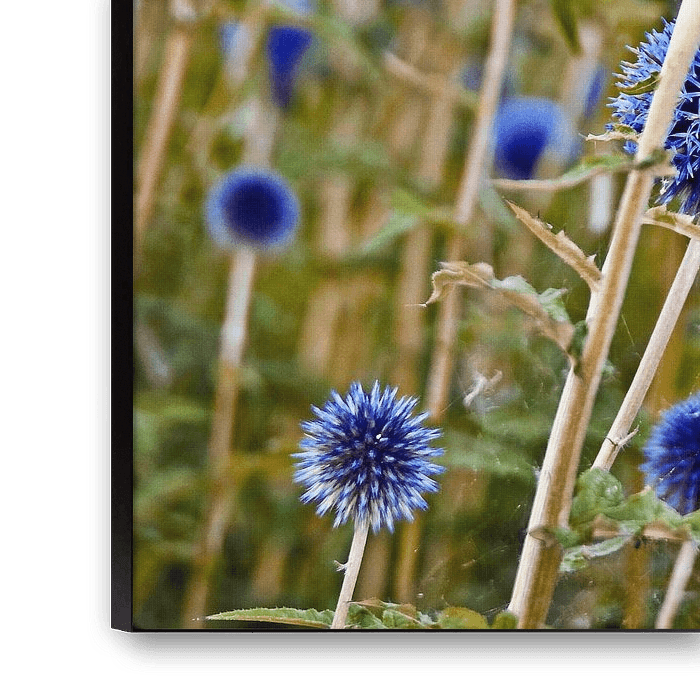 Dromerige, wilde blauwe distelbloesems in het zomeravondlicht in de Botanische Tuin van Berlijn.