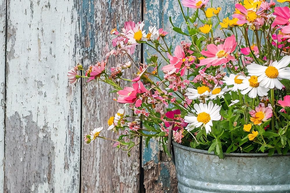 Dit ontwerp brengt een rustieke sfeer in elke ruimte met een levendige emmer vol kleurrijke wilde bloemen tegen een verweerde houten achtergrond. Het straalt een tijdloze charme uit, ideaal voor wie houdt van landelijke en klassieke interieurs. De combinatie van roze, gele, witte en groene tinten met het verweerde hout brengt het buitengevoel naar binnen en voegt warmte en authenticiteit toe. Perfect om sfeer te creëren in woonkamers of eetruimtes waar een vleugje natuur gewenst is. Een sfeervol en charmant stuk dat kleur en vrolijkheid toevoegt aan elke muur.