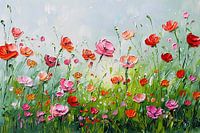 Dit schilderij brengt de schoonheid van een zomerse weide vol met bloeiende wilde bloemen tot leven. De levendige kleuren en de impressionistische stijl zorgen voor een vrolijke en opgewekte sfeer. De bloemen in verschillende tinten rood, roze en oranje staan hoog in het gras, tegen een lichtblauwe lucht. Dit kunstwerk is perfect voor…