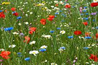 Tuin met wilde bloemen zoals: klaproos, korenbloem, bolderik, koolzaad, margriet, dagkoekoeksbloem en haviksbloem.