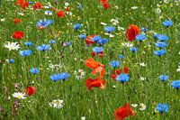 Tuin met wilde bloemen zoals: klaproos, korenbloem, bolderik, koolzaad, margriet, dagkoekoeksbloem en haviksbloem.
