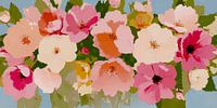 Voeg kunst toe aan je muren en maak er een echt thuis van met dit moderne bloementuinlandschap in een vrolijke moderne stijl in roze, oranje, perzik, groen, rood, pastel oranje, pastel brons en beige.