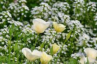Het slaapmutsje vooraan is zijdeachtig wit van kleur. Een prachtig veld van wilde bloemen met de frisgroene kleuren van de stelen en bladeren eromheen.