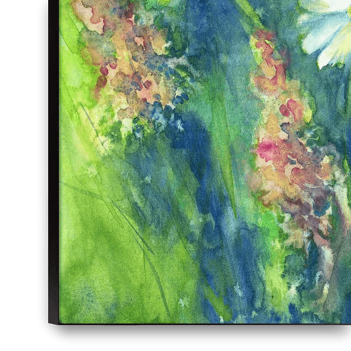 Wilde bloemenweide met madeliefjes is een aquarel schilderij in portret formaat. Drie prachtige witte margrieten genieten van de zomerzon tussen frisgroen gras en andere wilde bloemen. Als u uw gazon niet maait, althans in sommige hoeken van uw tuin, wordt u beloond met vrolijke wilde bloemen die het hart van bloemenliefhebbers en…