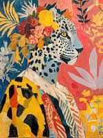 Een levendig abstract schilderij van een luipaard versierd met kleurrijke bloemen en een sjaal met patroon, tegen een levendige roze en gele achtergrond