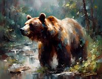 Een majestueuze bruine beer is afgebeeld te midden van een bebost landschap, met een sereen waterlichaam op de voorgrond. De dikke vacht van de beer is weergegeven in een mix van warme tinten die contrasteren met de koele tinten van de omgeving, waardoor een gevoel van wilde schoonheid ontstaat.