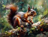 Een levendig gedetailleerde eekhoorn zit aandachtig op een tak, zijn borstelige staart elegant uitlopend. De kleine handjes van het beestje grijpen een noot, wat zijn nieuwsgierige uitdrukking complementeert tegen een weelderige, onscherpe achtergrond van groen gebladerte.