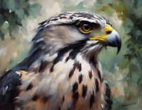 Een close-up portret vangt de intense blik en het gedetailleerde verenkleed van een havik. De scherpe snavel en doordringende gele ogen van de vogel vallen op tegen de zacht gemêleerde achtergrond met groene vleugjes.