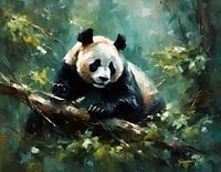Een panda rust comfortabel uit op een tak te midden van weelderig groen en staart naar voren met een zachte uitdrukking op zijn gezicht. De penseelstreken geven de scène een dynamisch en levendig gevoel en benadrukken het contrast tussen de zwart-witte vacht van de panda en het zachte groen van het gebladerte.