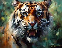 Een woeste tijger is afgebeeld midden in een brul, met zijn scherpe hoektanden bloot en zijn ogen intens gefocust. De achtergrond bestaat uit abstracte, geometrische penseelstreken in verschillende tinten groen en bruin, die het gevoel geven van een wilde, natuurlijke omgeving.