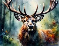 Een majestueus hert met een vol gewei is afgebeeld in levendige kleuren tegen de achtergrond van een mistig bos. Het kunstwerk heeft een etherische kwaliteit, met verfspatten die een levendige indruk rond het dier wekken.