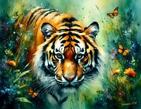 Een majestueuze tijger is afgebeeld met intense ogen die de kijker recht aanstaren, omringd door een dromerige, kleurrijke omgeving met vlinders en wilde bloemen. De kleuren zijn levendig en vermengen zich op een manier die de scène een gevoel van beweging en levendigheid geeft.