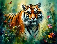 Een majestueuze tijger is afgebeeld met intense ogen die de kijker recht aanstaren, omringd door een dromerige, kleurrijke omgeving met vlinders en wilde bloemen. De kleuren zijn levendig en vermengen zich op een manier die de scène een gevoel van beweging en levendigheid geeft.
