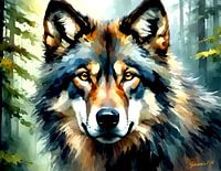 Een majestueuze wolf met scherpe ogen is afgebeeld tegen de achtergrond van een mistig bos. De afbeelding is gemaakt met een aquareleffect, waardoor het een levendige maar dromerige kwaliteit heeft.