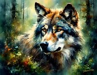 Een levendig portret van een wolf kijkt naar buiten, tegen een vage achtergrond die doet denken aan een bos. De kleuren zijn rijk en intens, met scherpe details op de wolf die contrasteren met de zachtere, meer abstracte omgeving.
