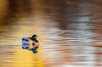Wilde eend (Anas platyrhynchos) zwemmend op een meer in het natuurreservaat Mönchbruch bij Frankfurt, Duitsland.