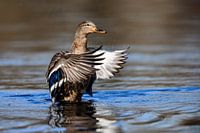 Vrouwtje wilde eend (Anas platyrhynchos) zwemmend in een meer in het natuurreservaat Mönchbruch bij Frankfurt, Duitsland.