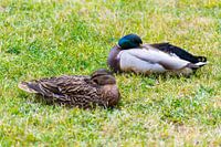Wilde eenden (Anas platyrhynchos) maken het zich gemakkelijk op het gazon en genieten van hun samenzijn en zijn gelukkig samen