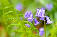 Wilde hyacint bloem met een varen ernaast in het Hallerbos in België.