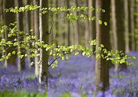 paars blauwe boshyacinten (hyacinthoides non-cripta) bloeien in het voorjaar in het Hallerbos, de beukenbomen hebben hun eerste lichtgroene blaadjes