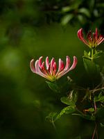 Verstopt tussen de groene bladeren viel mijn oog op de bloeiende kamperfoelie struik waar dat ook het zonlicht er nog eens mooi op scheen.