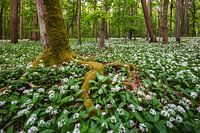 Een bemoste boomwortel kronkelt door de wilde knoflook.