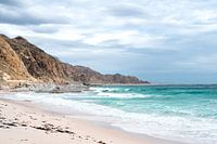 Een ruige kustlijn met bergen en en een fwlgekleurde turquoise zee, het is niet meteen waar mensen aan denken als ze zich Oman voorstellen. Dit is een van de vele stranden onderweg langs de Omaanse kust naar het zuiden. Donkere wolken verzamelen zich aan de horizon. Golven breken op de rotsen in zee, de Arabische Zee. We reisden een maand lang wildkamperend door Oman, slapend bij stranden als deze en in de valleien, wadi's, uitgesleten in de Omaanse bergen. Op de kaart staat dit strand als Dolphin Beach gemarkeerd. De weg wurmt zich tussen de bergwand en het strand naar het zuiden.