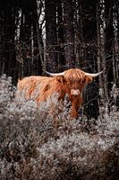 Deze afbeelding toont een close-up van een imposante oranje gekleurde os met een bos op de achtergrond. Het beeld heeft een mysterieuze en donkere sfeer, waarbij de ox in het centrum staat, omringd door de schaduwen van de bomen. De oranje kleur van de os steekt intens af tegen de donkere achtergrond, waardoor het een krachtige en tegelijkertijd enigmatische uitstraling heeft. De natuurlijke setting van het bos voegt een extra laag van wildernis en sereniteit toe aan het tafereel