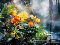 Een plantenportret met wilde gele orchideeën in het weelderige groen van het nevelwoud. Een beeld in de stijl en kleuren van Botanical Brilliance.