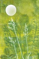 Deze botanische monotype of monoprint is gemaakt met een gelliplate en acrylverf. Een uniek handgemaakt en eenmalig werk, er kan maar 1 afdruk worden gemaakt van je ontwerp. Door de grafische druktechniek en het gebruikte papier ontstaan er allerlei structuren en effecten. Bij dit werk heb ik bloemetjes, planten, bladeren en grassen geplukt en deze in de verf gedrukt. Door meerdere keren over elkaar te drukken ontstaat dit unieke werk. Doordat er wit is uitgespaard houdt het werk zijn frisheid. De limoengroene kleur is gedurfd en fris. Een donkere tint groen geeft de planten op de achtergrond weer. Met een cirkel als maan heb je een klein landschap