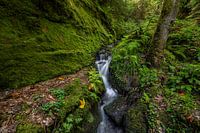 Mossen en varens bedekken de rotsen en het water baant zich een weg door het doolhof van rotsen.