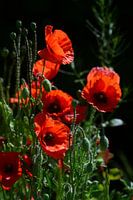 Voor een donkere achtergrond felrode wilde klaprozenbloesem op een weide