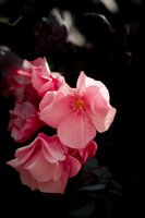 Een paar enkele roze rozen tegen een donkere achtergrond. Dit geeft nog duidelijker weer hoe mooi die bloemen zijn.