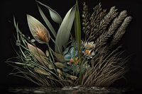Wilde Gelassenheit präsentiert eine faszinierende Anordnung natürlicher Formen, die aus stillen, spiegelnden Gewässern hervortreten und die ruhige Harmonie und das komplexe Gleichgewicht der wilden Pflanzenwelt hervorrufen. Vor einem tiefen, samtigen schwarzen Hintergrund entfaltet sich die Szene wie eine lebende Skulptur – eine zarte und doch dynamische Komposition aus Gräsern, Schilf und Blüten, die sich in anmutiger Bewegung miteinander verflechten. Jeder Stiel und jedes Blatt strahlt Individualität aus und trägt gleichzeitig zum einheitlichen Rhythmus des Ganzen bei.
