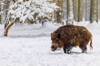 Een wild zwijn in het wildpark in Chemnitz loopt door de sneeuw.