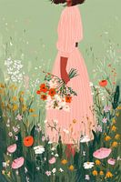 Een illustratie van een vrouw in een delicate roze jurk, omringd door een weelderige bloemenweide. De zachte pasteltinten van roze en saliegroen creëren een dromerige sfeer, terwijl oranje papavers en witte margrietjes een levendig contrast vormen. Het romantische tafereel ademt de essentie van een zorgeloze zomerdag, waarbij de jurk elegant meebeweegt met de bloemen in de wind.
