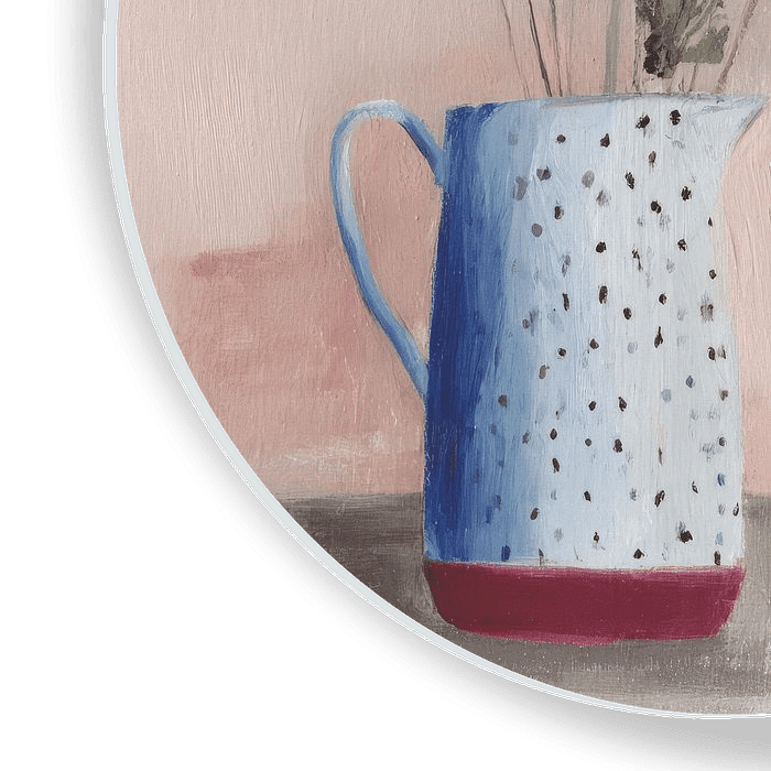 Een bloemige kunstprint met een nonchalant geplukt veldboeket in een lichtblauwe kan. De zachte penseelstreken en subtiele kleurverloopjes maken dit werk warm, rustig en heel natuurlijk. Voor een interieur met een poëtische en creatieve sfeer.