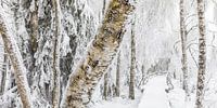 Berkenbomen en het wandelpad of de loopbrug door het besneeuwde Wildseemoor bij de Wildsee in het natuur- en bosreservaat Kaltenbronn tussen Gernsbach en Bad Wildbad in de winter, Noordelijk Zwarte Woud, Zwarte Woud, Baden-Württemberg, Duitsland