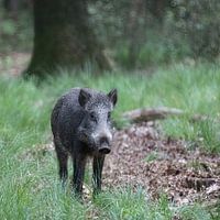 Dit wilde zwijn (Sus Scrofa) staat mij aan te kijken omdat ik hen stoor bij het zoeken naar voedsel in de bodem, waarbij hij de grond flink losmaakt. Goed voor het zwijntje en goede voor het bos!