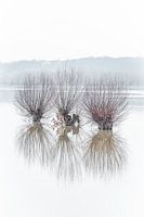 Een groepje knotwilgen staat in het water bij hoog water in de uiterwaarden van de Nederrijn bij Wageningen in Gelderland. De vormen van de knotwilgen komen nog beter tot hun door de reflectie in het rimpelloze water.