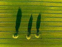 Wilgen in een vers gemaaid weiland tijdens een vroege ochtend in de IJsseldelta-regio in Overijssel, van bovenaf gezien.