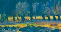 Een rij wilgen langs een plas in prachtige groen en gele verfstreken. Snel, ferm maar trefzeker geschilderd. Een prachtig werk van Nop Briex op groot formaat 150 x 80 cm. Natuurlijk kunt u zelf het gewenste formaat aanpassen. Een schitterend bijna abstract en toch figuratief werk. Er is ook een versie in blauw en oranje teinten.