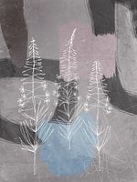 Abstracte botanische illustratie met Wilgenroosje bloemen, organische vormen, texturen en markeringen.